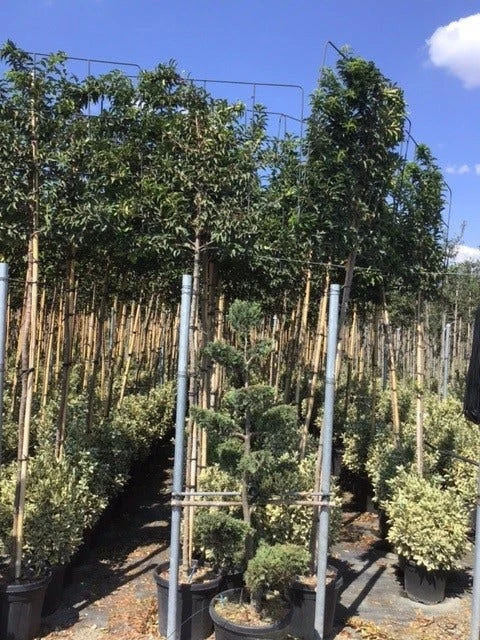 Portugese laurier als leiboom (Prunus lusitanica), dit is een groenblijvende leiboom. De Portugese laurier heeft een mooie lichtgroene bladkleur en heeft kleiner blad dan de normale laurier. De Portugese laurier groeit ook langzamer dan de gewone laurier, zodat u minder hoeft te snoeien.